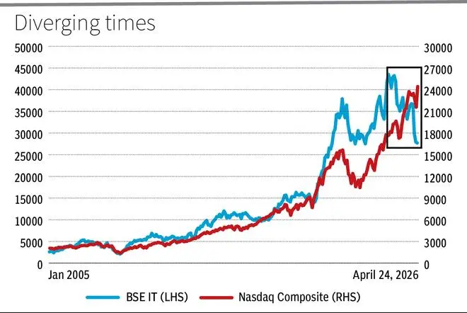 The BSE IT and the NASDAQ Composite have at all times moved in tandem. But there was some divergence since 2025. The NASDAQ Composite index has surged 29 per cent since December 2024. The BSE IT index, however, has tumbled 36 per cent over the identical interval.