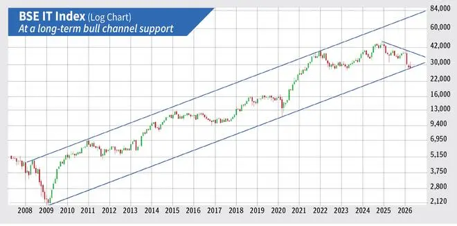 In our Big Story, “Sectors to play in 2026”, written in January this yr, we had given a purchase within the BSE IT index. The index was then at 36,795 and we had forecast for a rally to 49,500 by the top of this yr. This view has gone unsuitable. The BSE IT index tumbled nicely past our stop-loss stage of 30,600 to the touch a low of 27,428 final month. It is at the moment at 27,648.74